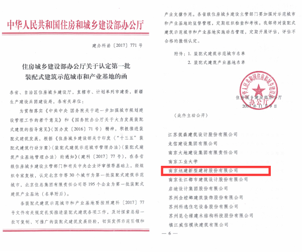 2017年11月9日,住房城鄉(xiāng)建設(shè)部辦公廳印發(fā)《關(guān)于認定第一批裝配式建筑示范城市和產(chǎn)業(yè)基地的函》,南京旭建公司成為第一批按照《裝配式建筑產(chǎn)業(yè)基地管理辦法》認定的國家“裝配式建筑產(chǎn)業(yè)基地”。