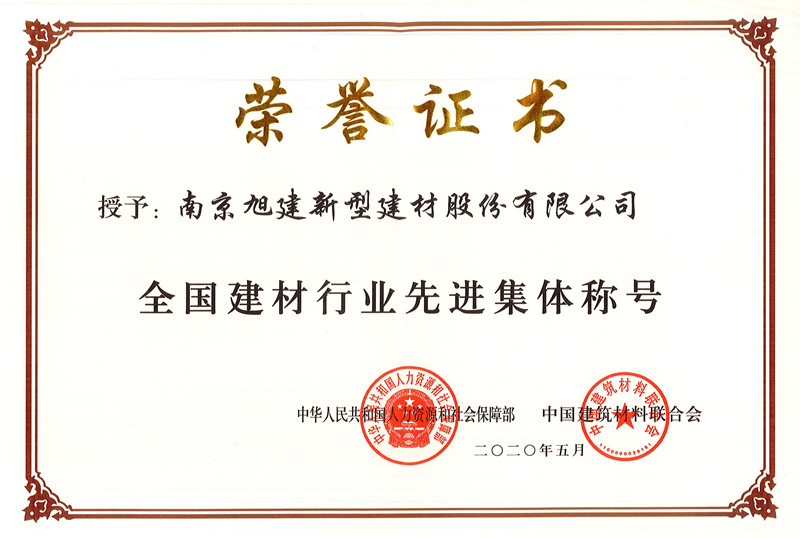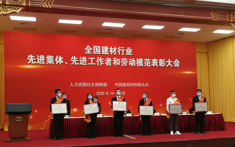 2020年8月14日人力資源社會(huì)保障部、中國建筑材料聯(lián)合會(huì)在北京友誼賓館召開了關(guān)于“全國建材行業(yè)先進(jìn)集體、先進(jìn)工作者和勞動(dòng)模范表彰大會(huì)”,會(huì)上對(duì)來自全國的98個(gè)單位、95名個(gè)人進(jìn)行了表彰,南京旭建新型建材股份有限公司榮獲“全國建材行業(yè)先進(jìn)集體”稱號(hào)。