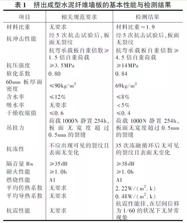 由福泰高科環(huán)??萍?上海)有限公司提供的復(fù)合墻板相關(guān)檢測(cè)報(bào)告表明,擠出成型水泥纖維墻板完全滿足鋼結(jié)構(gòu)住宅對(duì)維護(hù)墻板高強(qiáng)、輕質(zhì)、具有良好的保溫隔熱、隔聲、防水、防火、抗裂和耐候等綜合性能的要求,表1為擠出成型水泥纖維墻板的基本性能與檢測(cè)結(jié)果與《建筑隔墻用輕質(zhì)條板》JGJ/T169-2005、《建筑用輕質(zhì)隔墻條板》GB/T23451-2009、《建筑材料及制品燃燒性能分級(jí)》GB86242006等相關(guān)規(guī)范要求指標(biāo)對(duì)比結(jié)果。