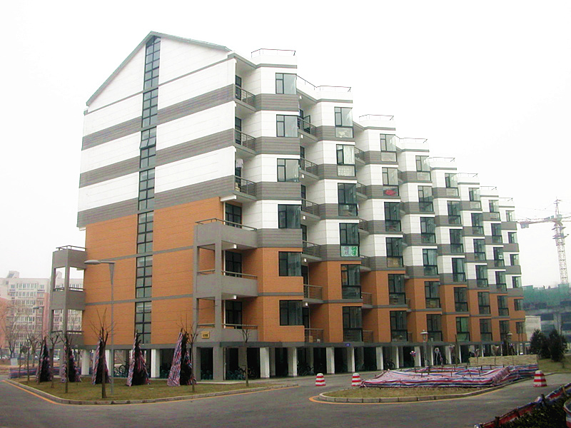 清華大學(xué)大石橋?qū)W生公寓,六層高約26米,建筑面積7000㎡。采用H型鋼柱,H型鋼梁,120厚壓型鋼板鋼筋砼樓板。外墻采用175厚NALC藝術(shù)板,鉤頭螺栓外掛式安裝;50厚NALC板防火包梁柱。